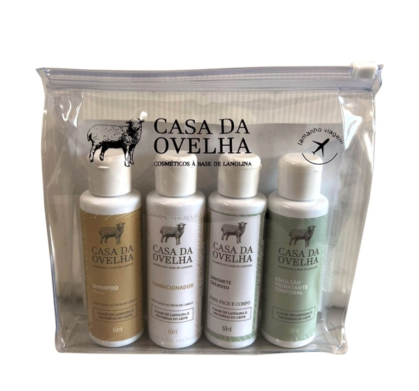 O Kit Viagem Casa da Ovelha reúne os principais cuidados para pele e cabelo em versões compactas, perfeitas para levar na mala, mochila ou nécessaire. Todos os produtos são formulados à base de lanolina, reconhecida por seu alto poder de hidratação e proteção da barreira natural da pele.